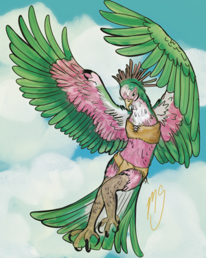She has bright green eyes,[1] and her body is covered with spring green feathers with white and slightly pink ones patterning down her limbs. Similar to Gnolls, she only wears few clothes, just enough for modesty.[2]