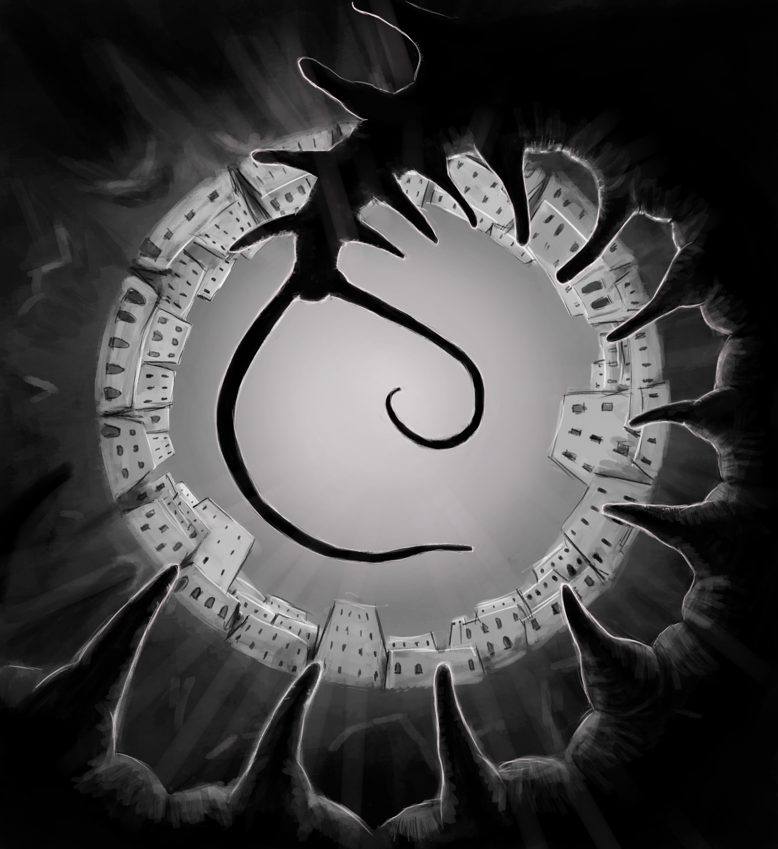 "The largest monster in the world. A writhing, sinuous red shape, with long whip-like arms and terribly strong suckers on the end of them. Razor mouth, slithering body, and intelligence, true intelligence lurking behind those tiny black eyes set onto the scaleless snake’s body, the twisted earthworm given legs. Carrion-feeder, corpse thief, infestation. And a form infinitely bigger than all her children, lurking in the darkness and waiting."[1]
