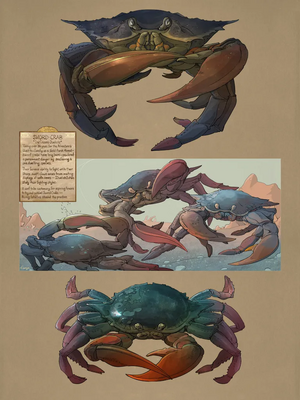Sword Crabs can be found in colonies.[1] Packs fight together and will come to each other's defense. They are able to taunt their opponents.[2]